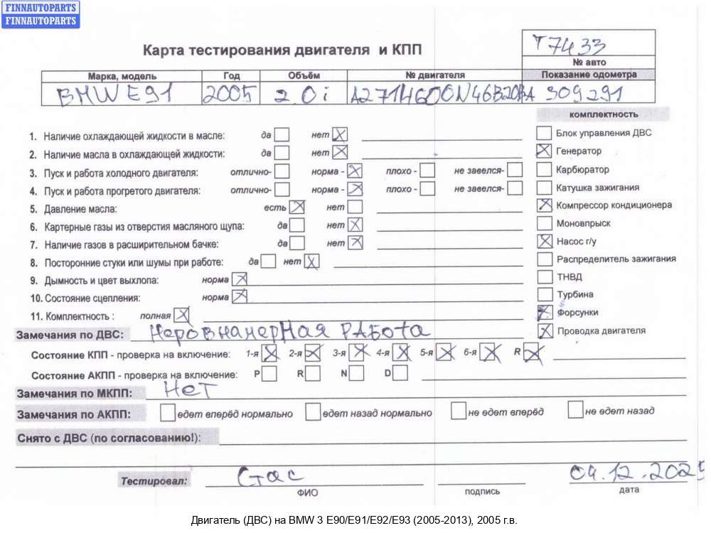 | Кемерово | 2009 | 2450324, 11002450324, 2009, 2л, Бензин, Инжектор, N43B20A, B5059085N43B20AY, 11002450324, 2450324, Седан, черный, B5059085N43B20AY | - | Г | К | С | Т | КК, прокручивается, состояние ГРМ - нормально, поддон - нормально, клапанная крышка - нормально, эмульсия - нет, 2 массовый, насос топливный - дефект разъема, форсунок нет на двс, | |||