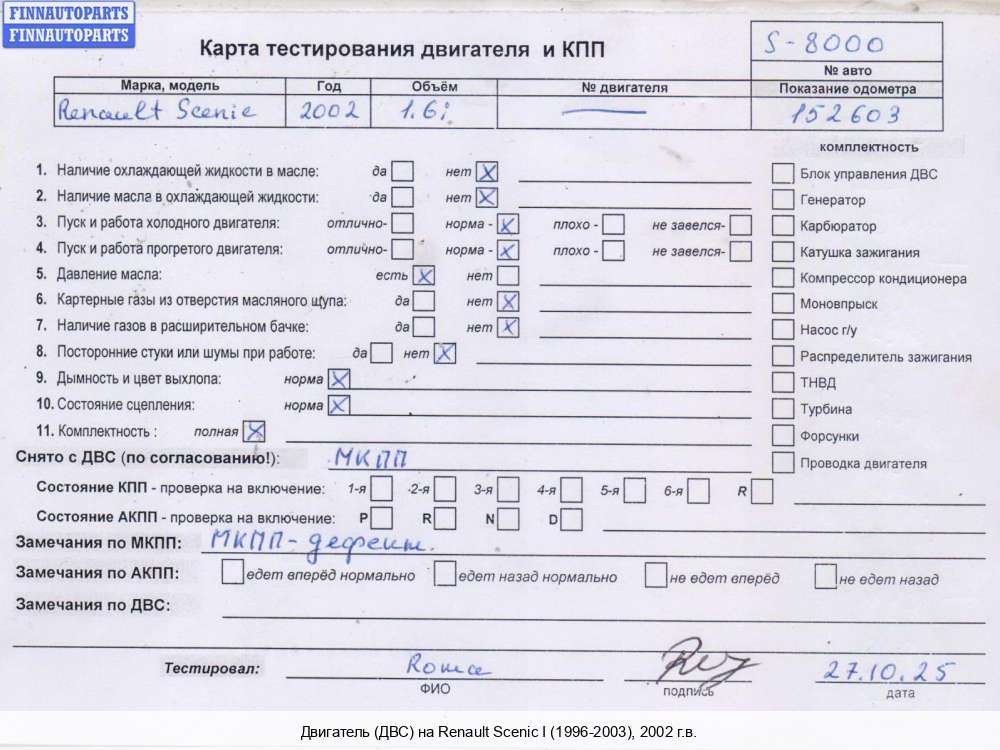 | Пенза | 2002 | 7701473512, 7701473513, 2002, 2л, Бензин, Инжектор, F4R 747, Б/Н (F4R747), 7701473512, 7701473513, Минивэн, серый, Фото не актуально, с запчасти отделены: Насос гидроусилителя руля (ГУР), Б/Н (F4R747) | - | Г | Т | КК, прокручивается, состояние ГРМ - нормально, поддон - нормально, клапанная крышка - нормально, эмульсия - нет, | |||